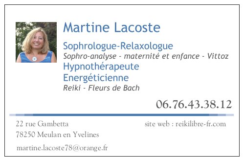 Martine LACOSTE, Sophrologue Relaxologue, Hypnothérapeute, Energéticienne, Reiki à Carcassonne